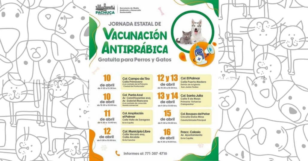 Dicha jornada de vacunación antirrábica en Hidalgo contará con más de mil puestos de vacunación ubicados en los centros de salud con un horario de atención de 8 de la mañana a 4 de la tarde, así mismo, se habilitan las unidades médicas rurales, en donde se hará la aplicación de la vacuna de manera gratuita, la entrega de un comprobante, y la placa de identificación para hacer referencia a la o al vacunado.