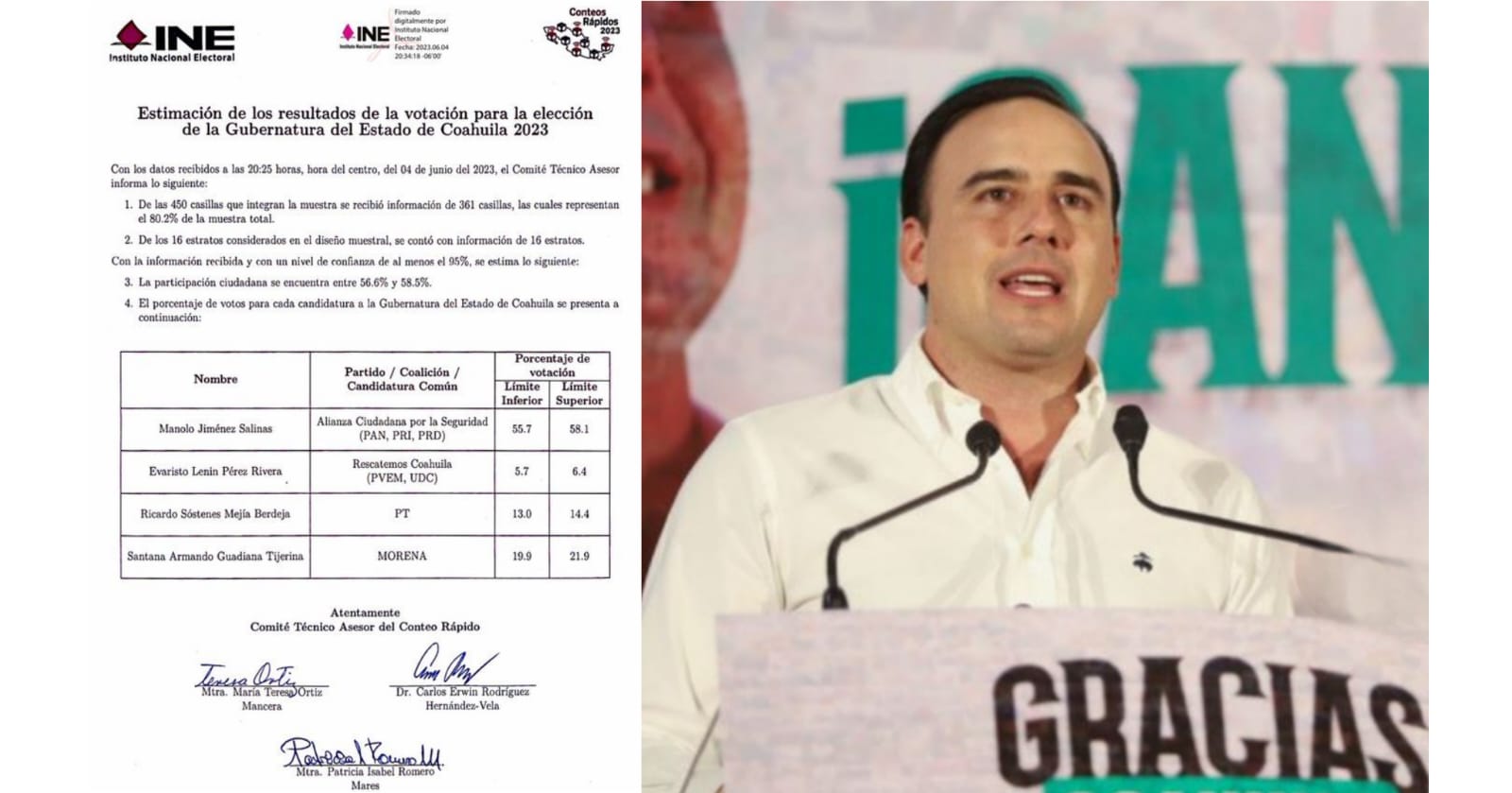 El conteo rápido dado a conocer por el Instituto Nacional Electoral (INE) confirmó el triunfo Manolo Jiménez como el próximo gobernador de Coahuila, con hasta 58.1% de los votos.