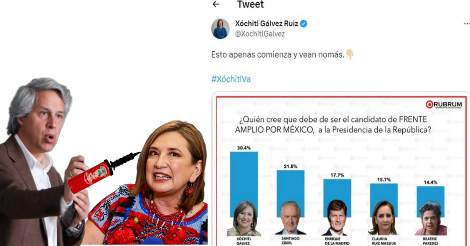 Xóchitl Gálvez dice que si realmente la oposición quiere ganar la presidencia de la república en el 2024, tiene que cerrar filas en torno a ella, pues se dice que es la única que tiene posibilidad de triunfo electoral, y aunque reconoce que Beatriz Paredes, Enrique de la Madrid y Santiago Creel, tienen capacidad y trayectoria personal, nunca ganarían puyes ellos son justo lo que este país ya no quiere.