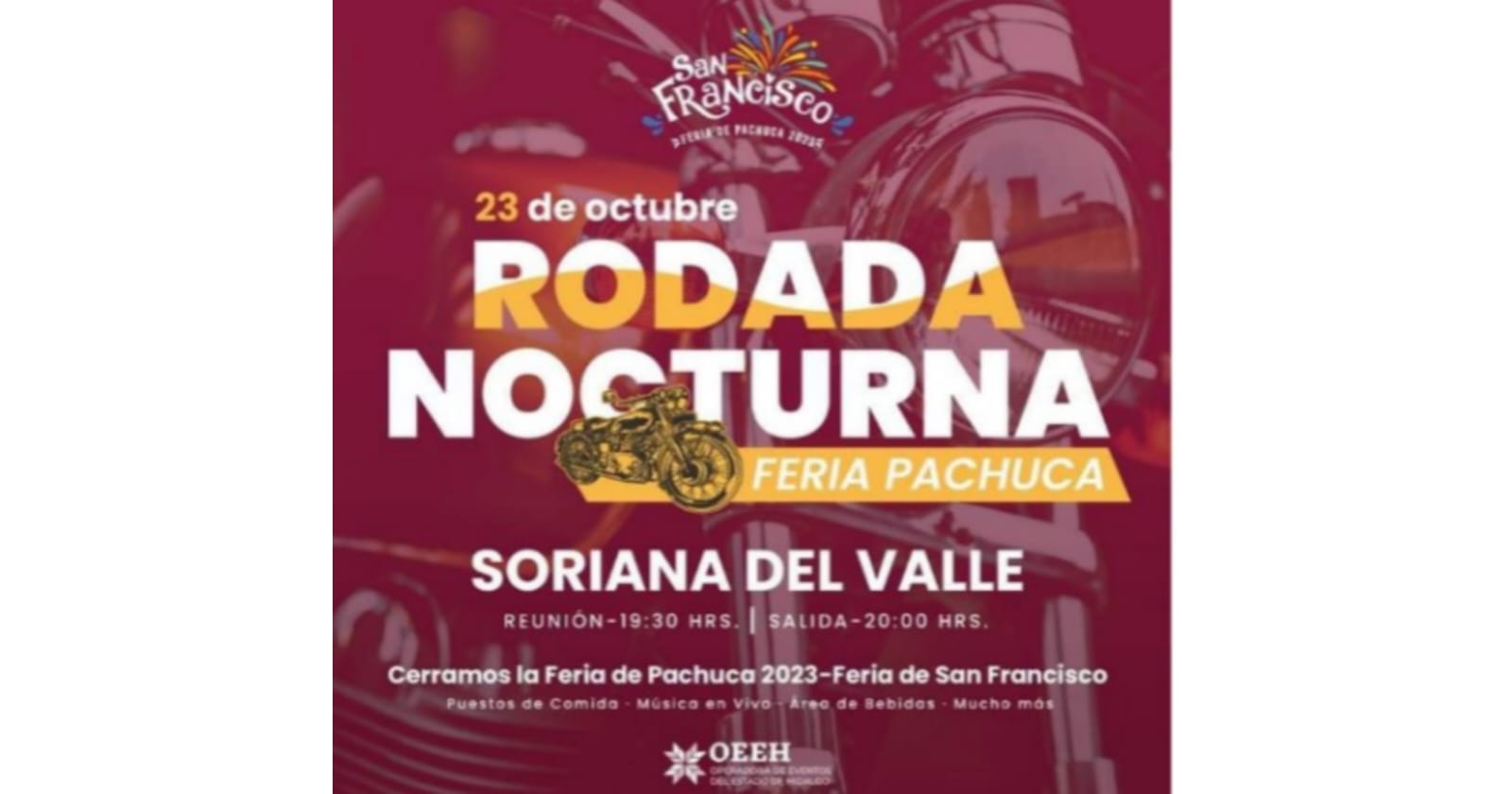 La Feria de San Francisco Pachuca Hidalgo 2023, invita a los aficionados de las motocicletas, a participar de la rodada nocturna para cerrar en grande los festejos de la fiesta más representativa de la entidad.