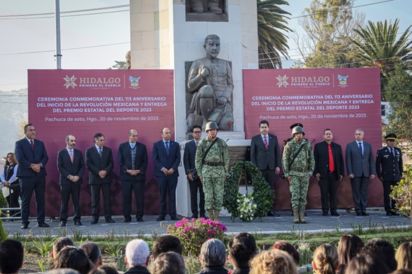 En representación del gobernador del estado, Julio Menchaca Salazar, el secretario de Educación Pública de Hidalgo, Natividad Castrejón Valdez, presidió la ceremonia del 113° Aniversario del Inicio de la Revolución Mexicana, evento donde también se entregó el Premio Estatal del Deporte 2023.