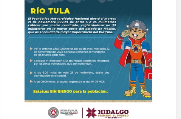 Por lo anterior, a las 13:00 horas del día de ayer, miércoles 22 de noviembre del 2023, Conagua comenzó el monitoreo —cada hora—, de los niveles del Río Tula, que resultaron en los siguientes datos: