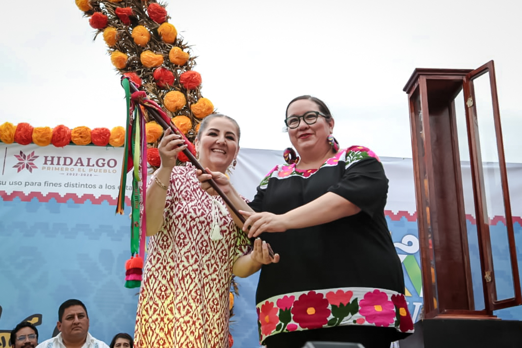 SAN FELIPE ORIZATLÁN / YAHUALICA. – Tania Meza Escorza, secretaria de Cultura en Hidalgo, entregó a Erika Saab Lara, presidenta municipal de San Felipe Orizatlán, el Bastón de Mando para dar inicio con las actividades del XXVI Festival de la Huasteca en la plaza principal del “lugar de arroz”.
