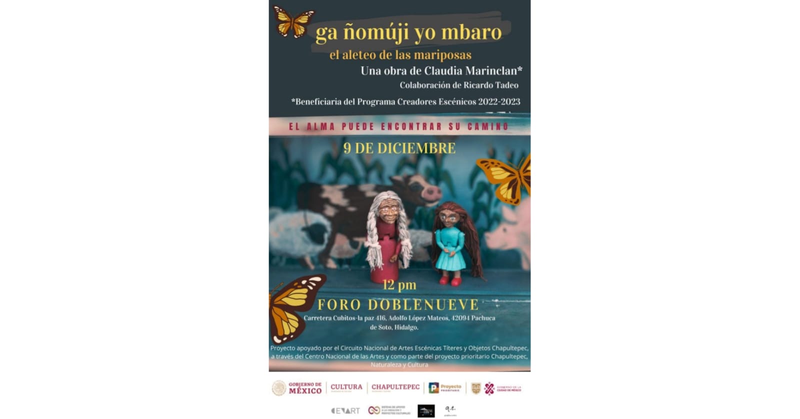 Proyecto apoyado por el Circuito Nacional de Artes Escénicas Chapultepec: Títeres y Objetos, a través del Centro Nacional de las Artes y como parte del proyecto prioritario Chapultepec, Naturaleza y Cultura”.