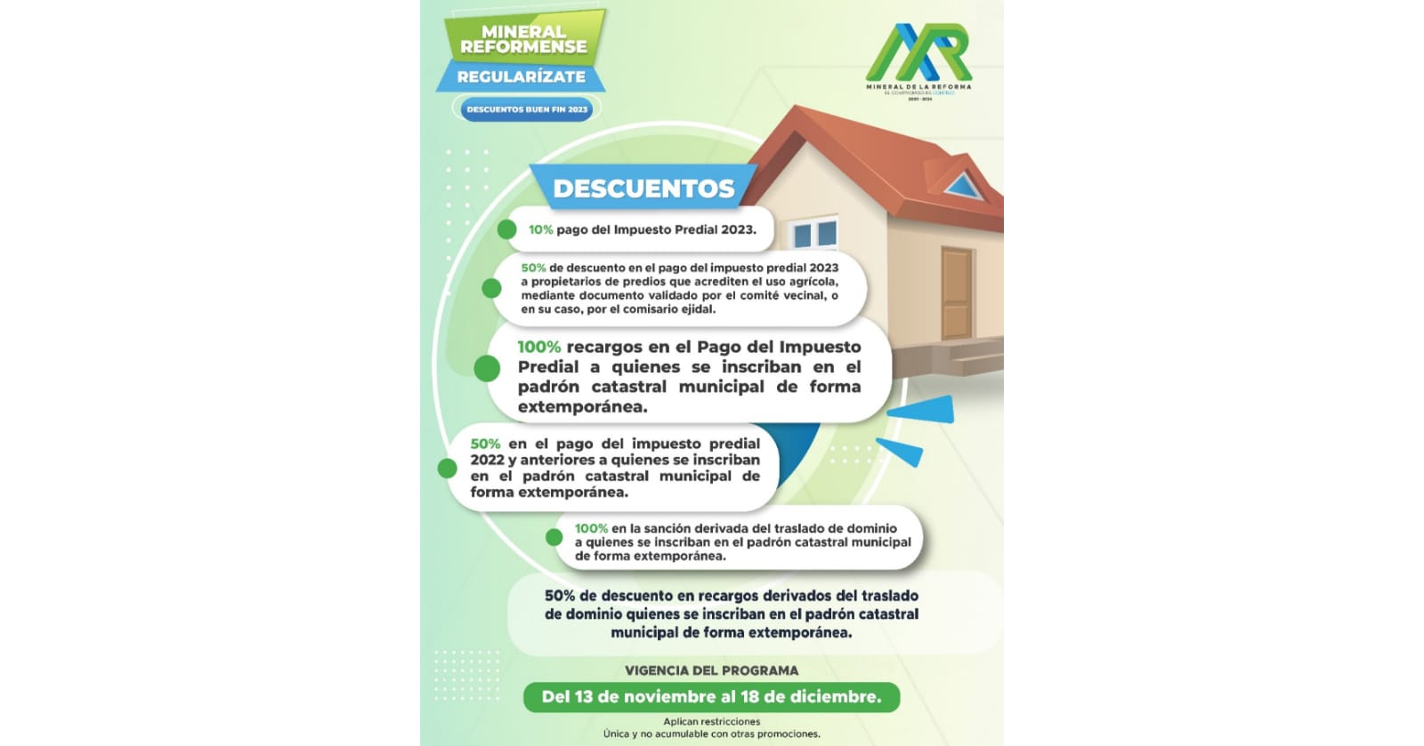 Además del descuento el 75% del impuesto predial 2023 a propietarios de predios que acrediten dependencia económica y residencia en Mineral de la Reforma, así como enfermedades como cáncer y padecimientos cerebrales, además el 50% de descuento en el pago del impuesto predial 2023 a propietarios de predios que acrediten actividad principal como docentes activos frente a grupos de educación inicial y/o básica, con domicilio en Mineral de la Reforma.