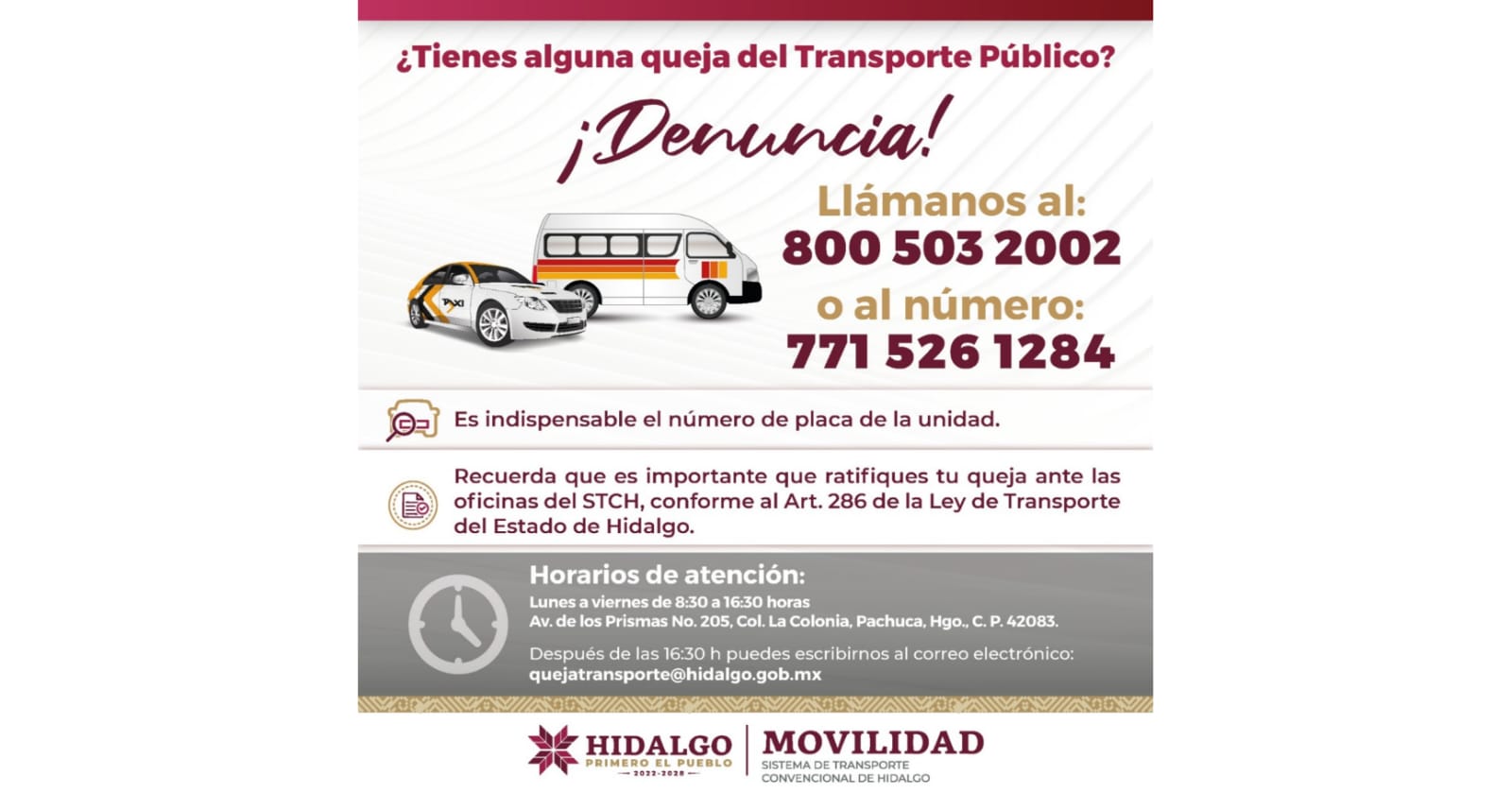Por ello, para garantizar un buen servicio, cualquier irregularidad puede ser denunciada a los teléfonos: 800 50 32 002 o al 771 52 61 284; también por correo electrónico a la dirección: quejatransporte@hidalgo.gob.mx, recordando que el seguimiento será vía mail, por lo que se sugiere usar una cuenta frecuente.