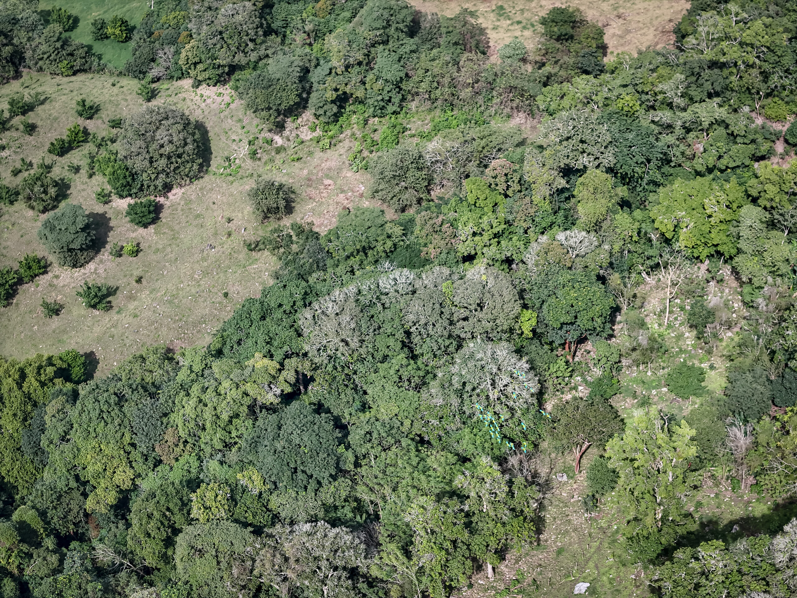 En el lugar, mediante la vigilancia a través de drones, se observaron 50 ejemplares en dos parvadas distintas, una compuesta por 26 guacamayas verdes y otra de 24.