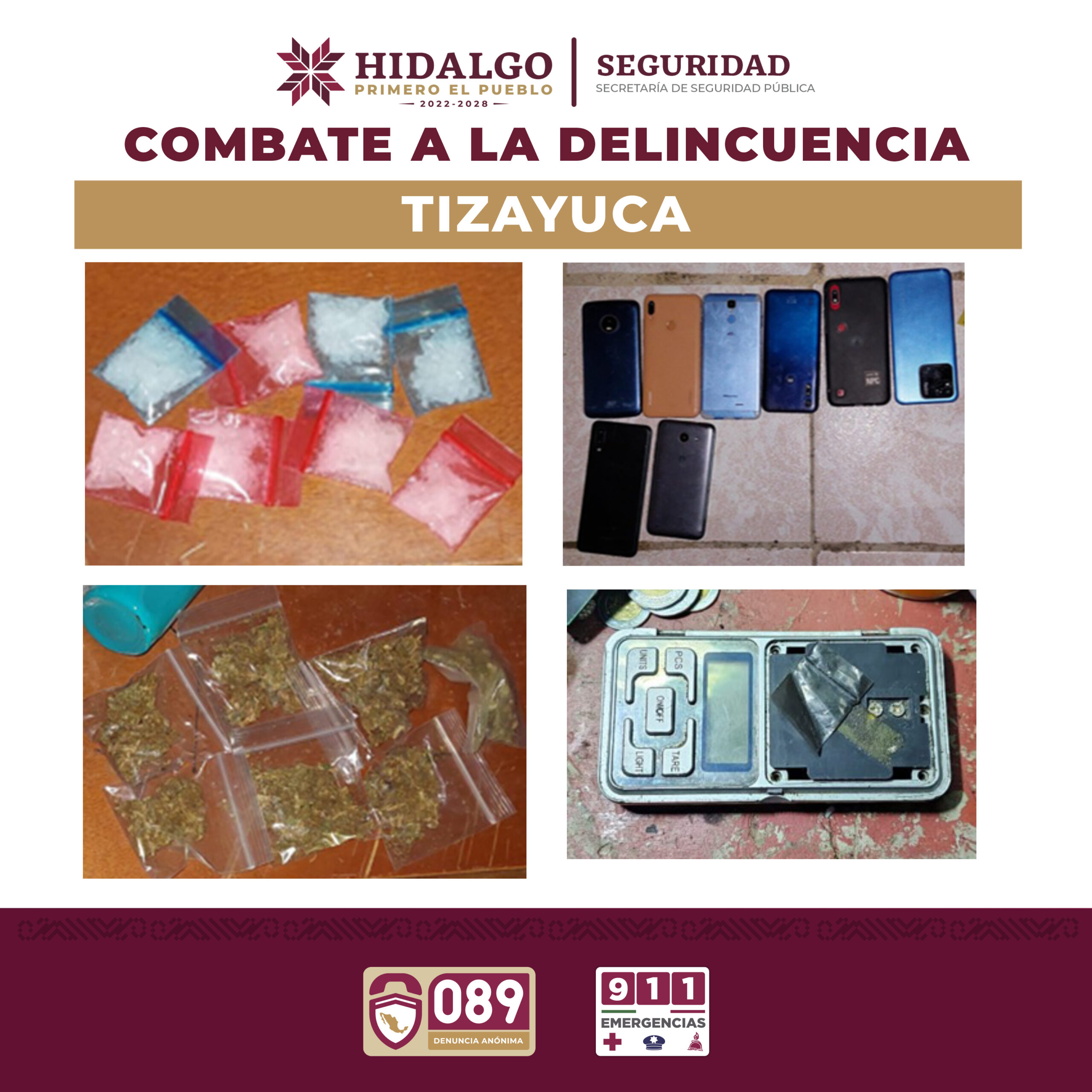 La Secretaría de Seguridad Pública de Hidalgo continuará impulsando acciones de combate frontal contra la delincuencia, por lo que se reitera el llamado a la ciudadanía para contribuir con estas acciones, realizando reportes mediante el 911 de Emergencias y/o al 089 de Denuncia Anónima.