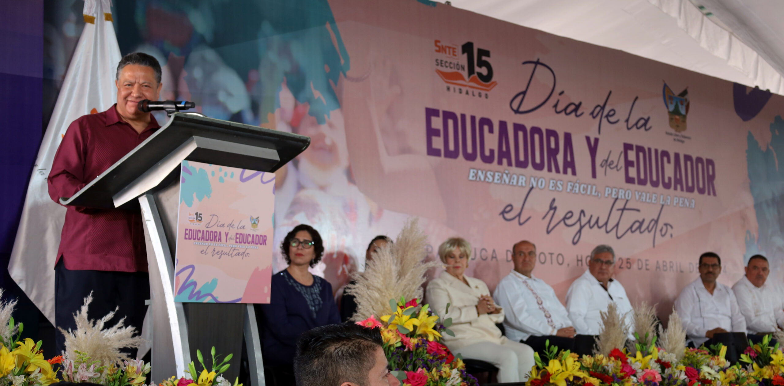 En su mensaje, el secretario general de la Sección XV del SNTE, destacó el respaldo que el Gobierno de Hidalgo ha mostrado hacia el magisterio hidalguense, por lo que esta celebración, que albergó a más de 5 mil educadoras y educadores, representa un reconocimiento al talento y al profesionalismo de quienes dedican su vida a la formación de la niñez en la entidad.