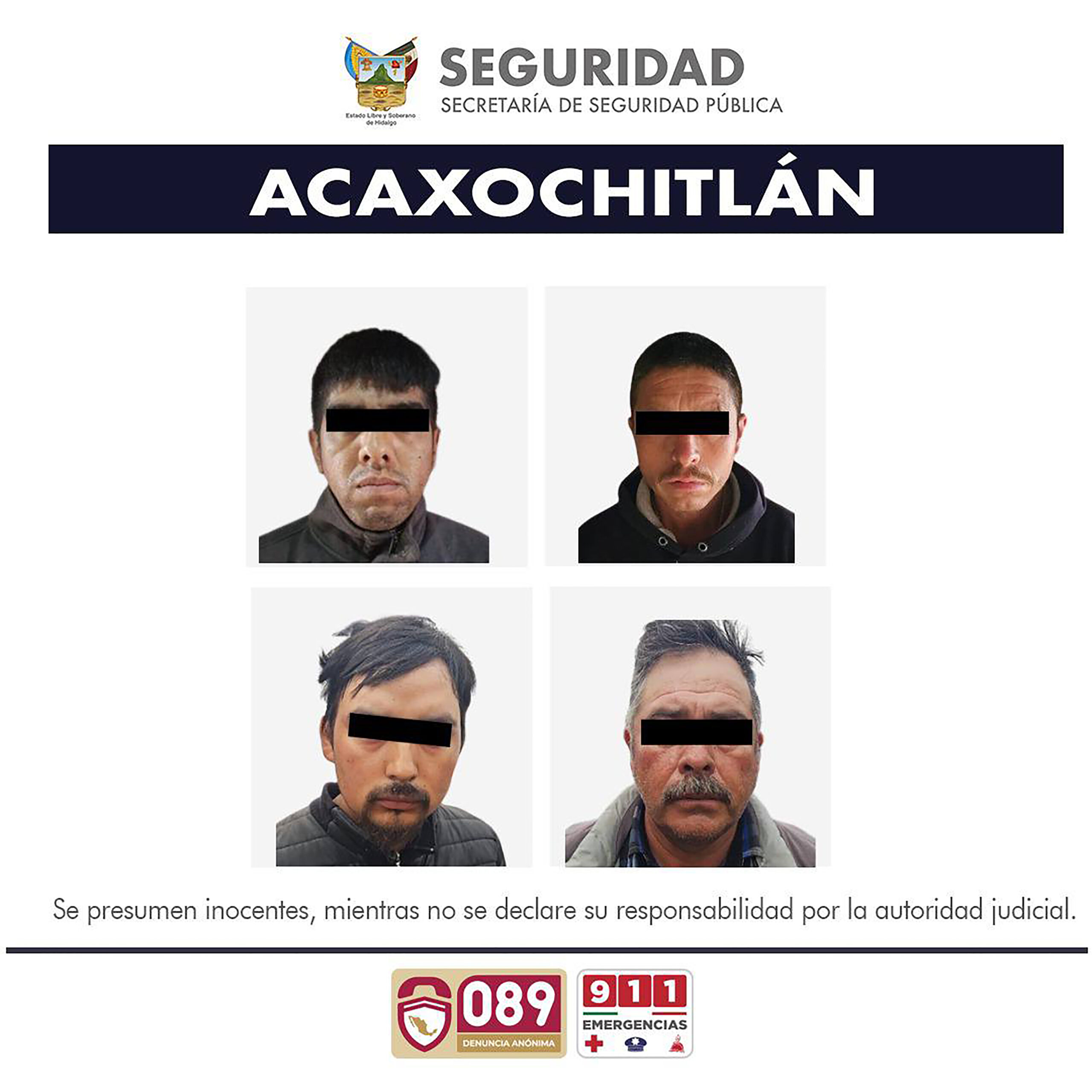 Tras la ejecución de un cateo en un predio del municipio de Acaxochitlán, fueron detenidos dos hombres que responden a las siglas J. C. L. C. y A. P. L., quienes están supuestamente vinculados con actividades de narcomenudeo y posesión ilegal de armas.