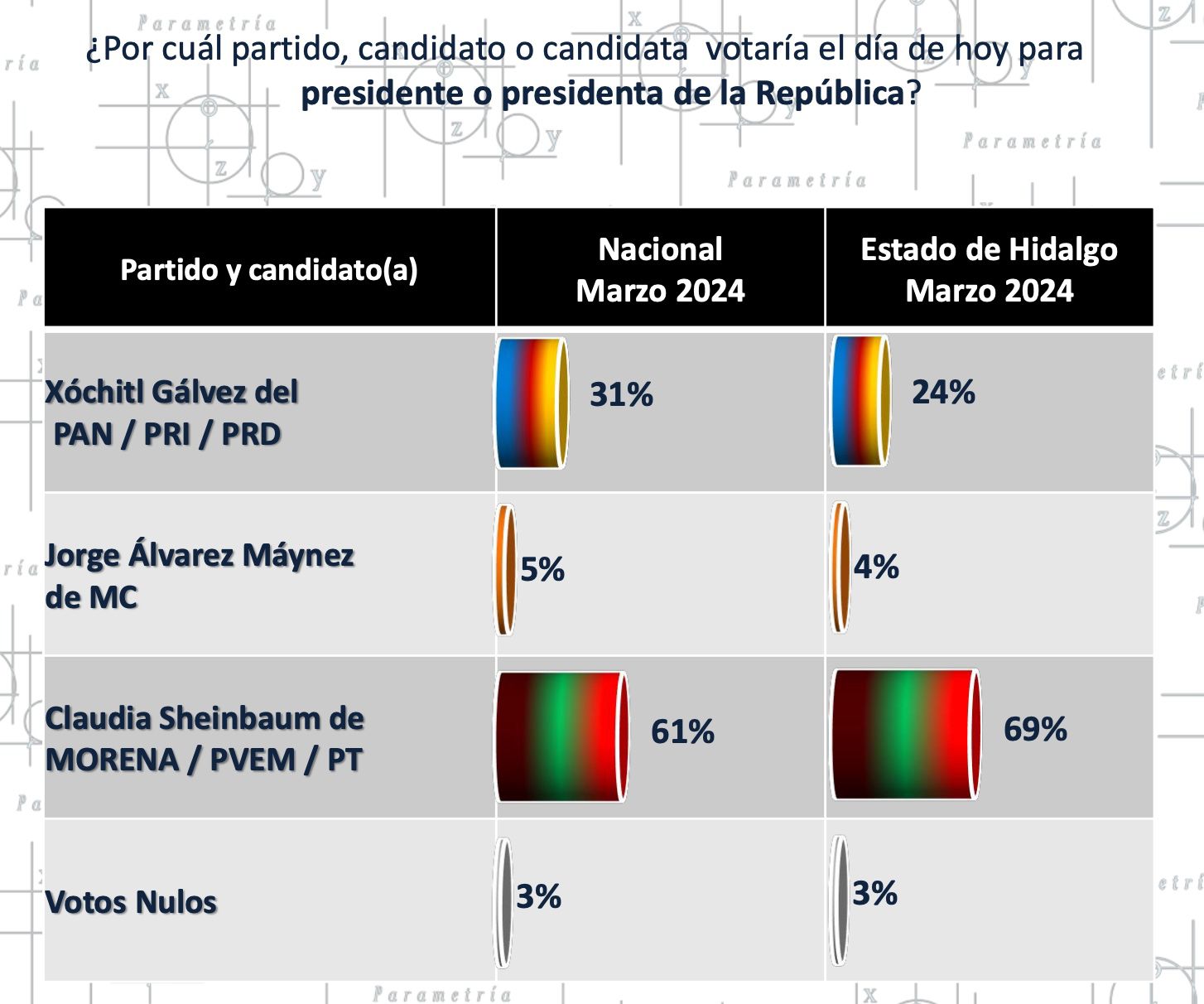 A solicitud del Consejo Coordinador Empresarial del Estado de Hidalgo (CCEH) y en preparación para los comicios electorales del 2 de junio, la casa encuestadora Parametría presentó los resultados de su más reciente instrumento en donde Claudia Sheinbaum, candidata de la coalición “Sigamos Haciendo Historia”, alcanza una intención de voto del 69% y un reconocimiento entre la ciudadanía del 71% que le representan ventajas de +45% y +57% respectivamente frente a Xóchitl Gálvez, quien no obstante ser nativa de esta entidad, solo destaca en la opinión negativa que despierta entre los ciudadanos.