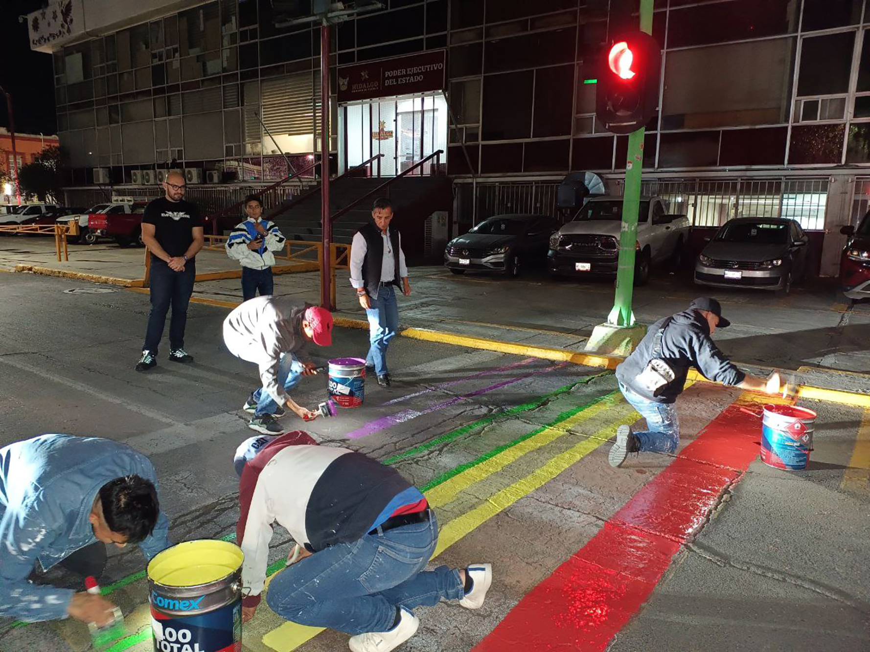 En este sentido, el director general de la OEEH, Marco Antonio Aranzábal Juárez, participó en la pinta de los pasos peatonales de la avenida Madero esquina con avenida Revolución, frente a Palacio de Gobierno y avenida Juárez con entronque a calle Guerrero, en la capital hidalguense, los cuales se vistieron con los colores de la bandera del arcoíris.