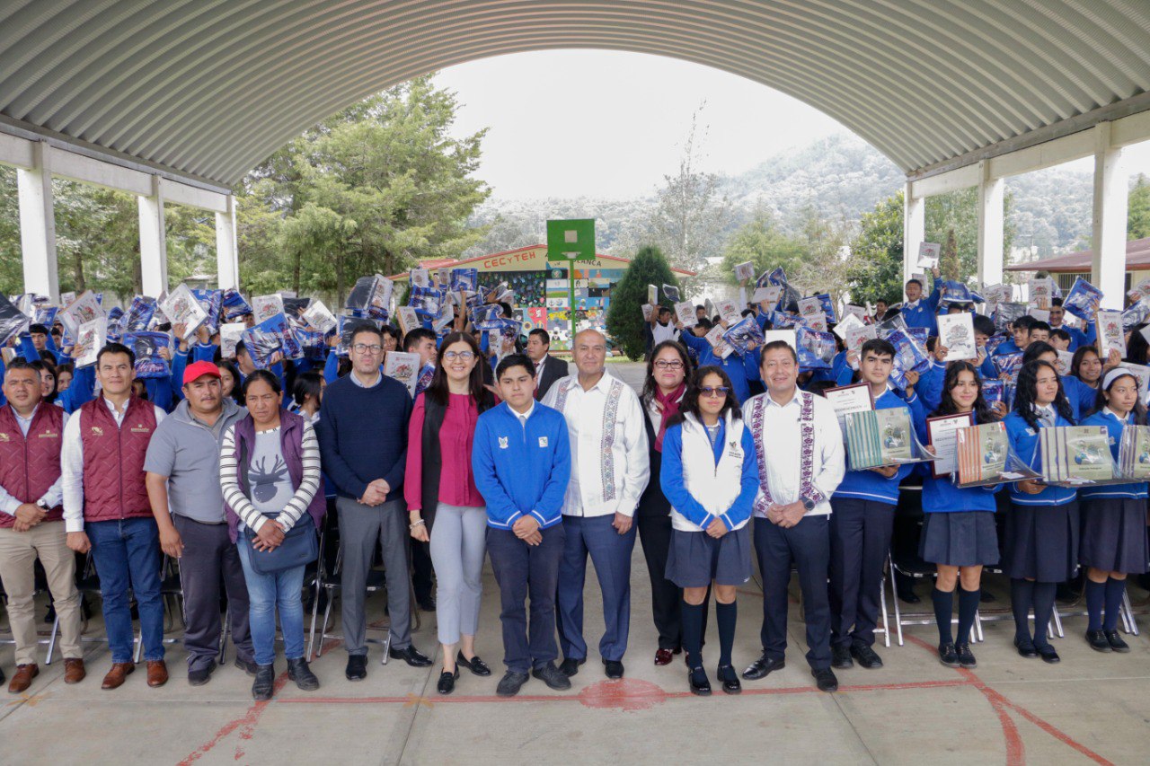 El secretario de Educación Pública de Hidalgo, Natividad Castrejón Valdez, encabezó el acto protocolario de entrega de 316 paquetes de libros y uniformes escolares en el Colegio de Estudios Científicos y Tecnológicos de Hidalgo (CECyTEH), plantel Agua Blanca.