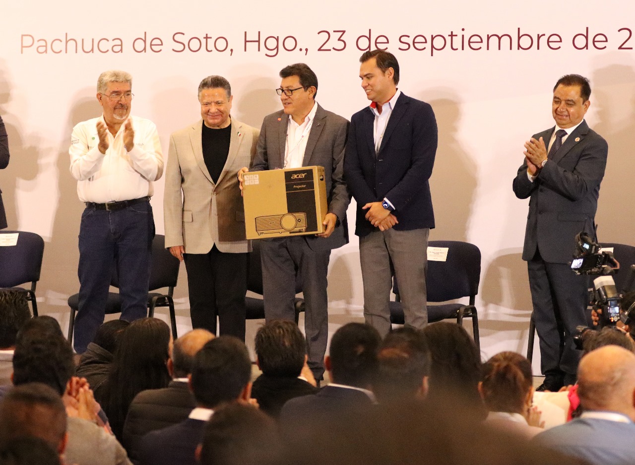 En ese sentido, junto a José Ángel Félix Sánchez, director local de la Comisión Nacional del Agua en Hidalgo, entregó 52 apoyos pertenecientes al programa de Fortalecimientos de Espacios de Cultura del Agua a Instancias Municipales, los cuales consisten en equipos de cómputo, proyectores y pantallas de plasma, que representan una inversión de 4 millones de pesos y que permitirán fortalecer la capacidad de cuidar y proteger este recurso vital.