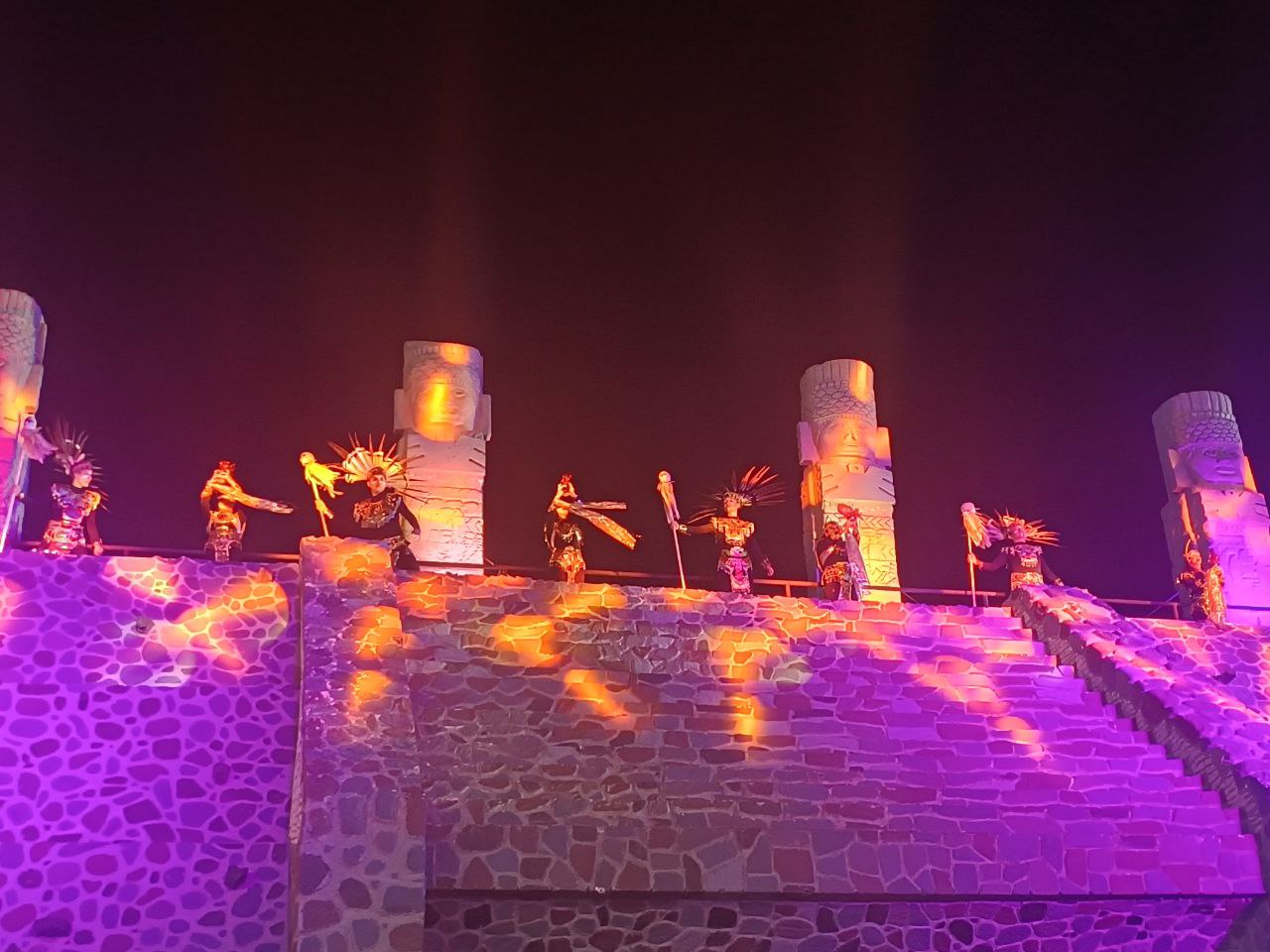 Este impresionante espectáculo tiene lugar diariamente en la Plaza San Francisco, con un entorno enmarcado por los emblemáticos Atlantes de Tula, que adornan la nave comercial. Las funciones se realizan en dos horarios: 19:00 y 20:30 horas.