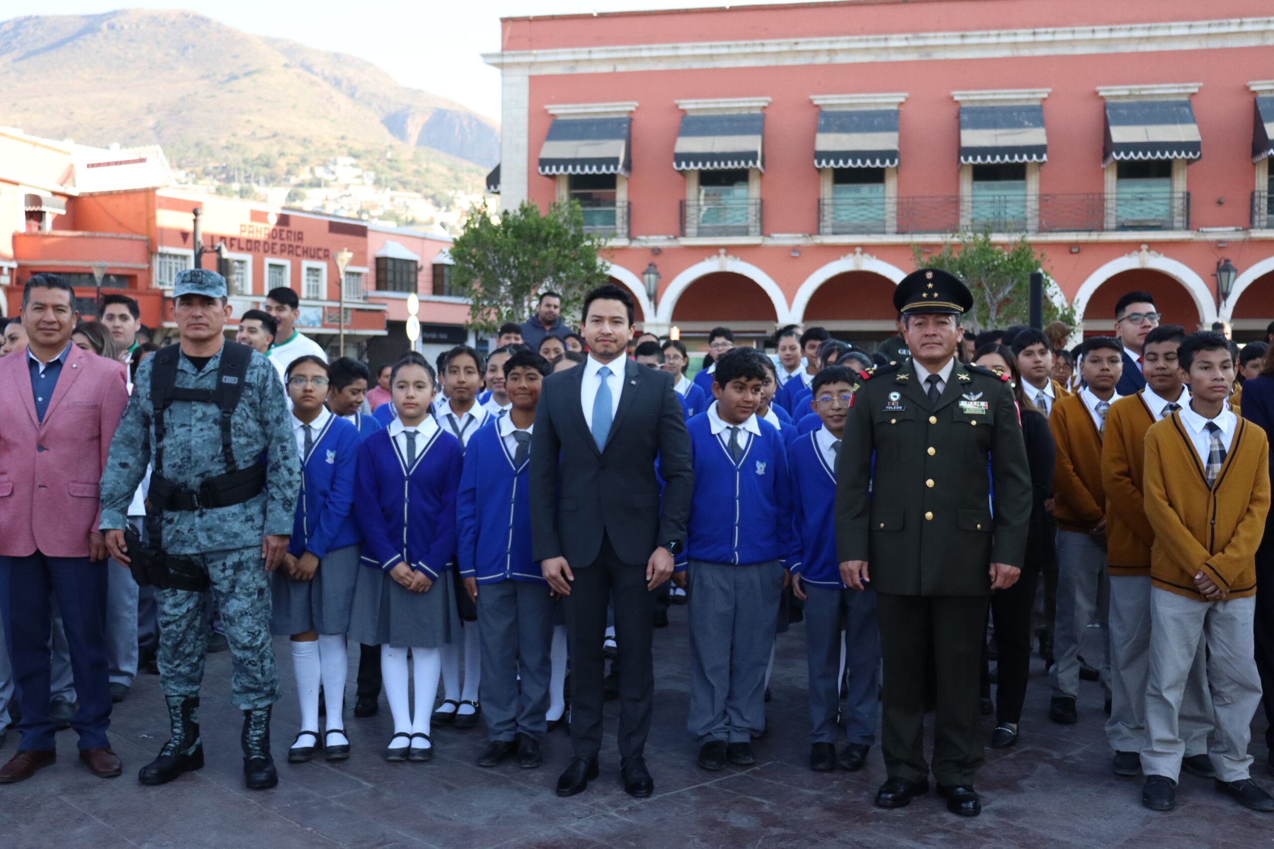 El secretario del Despacho del Gobernador de Hidalgo, Alejandro Velázquez Mendoza, encabezó los honores y el izamiento de la Bandera Nacional en la Plaza Juárez, en donde conminó a las y los estudiantes presentes a ser partícipes de la transformación de sus comunidades.