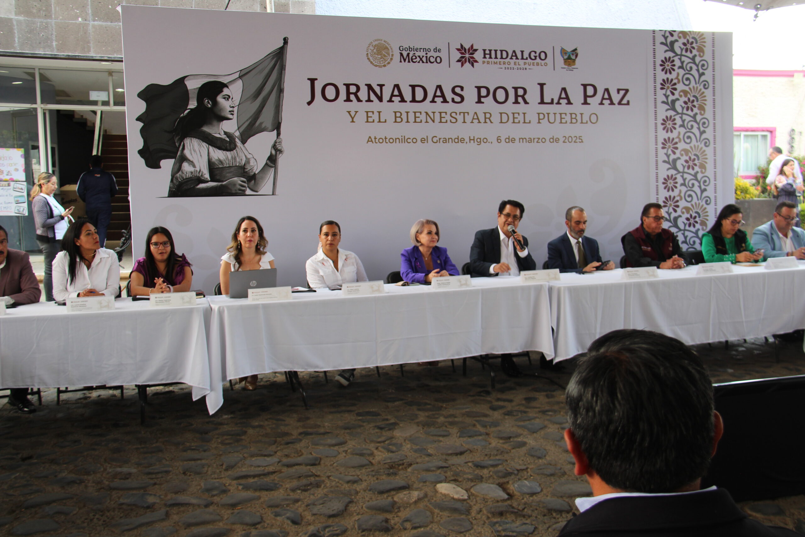 La tarde de este jueves, en la plaza principal del municipio de Atotonilco el Grande, autoridades estatales brindaron un informe sobre los avances de las solicitudes realizadas el pasado 20 de febrero en la denominada Jornada por la Paz y Bienestar del Pueblo con énfasis en atención a mujeres.