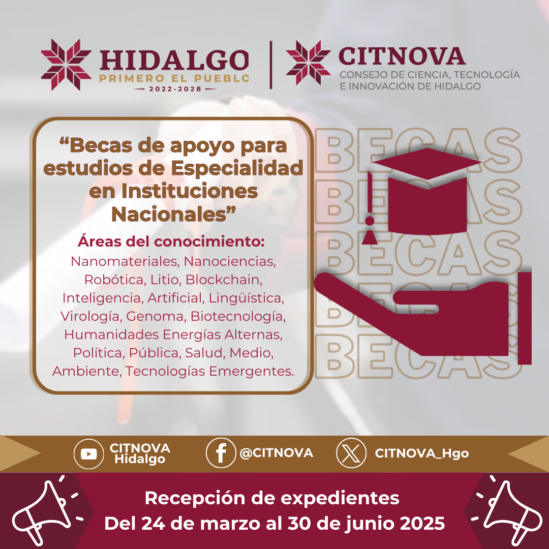 El Consejo de Ciencia, Tecnología e Innovación de Hidalgo (Citnova) ha lanzado cuatro convocatorias del programa “Becas para la formación de capital humano hidalguense en estudios de posgrado”.