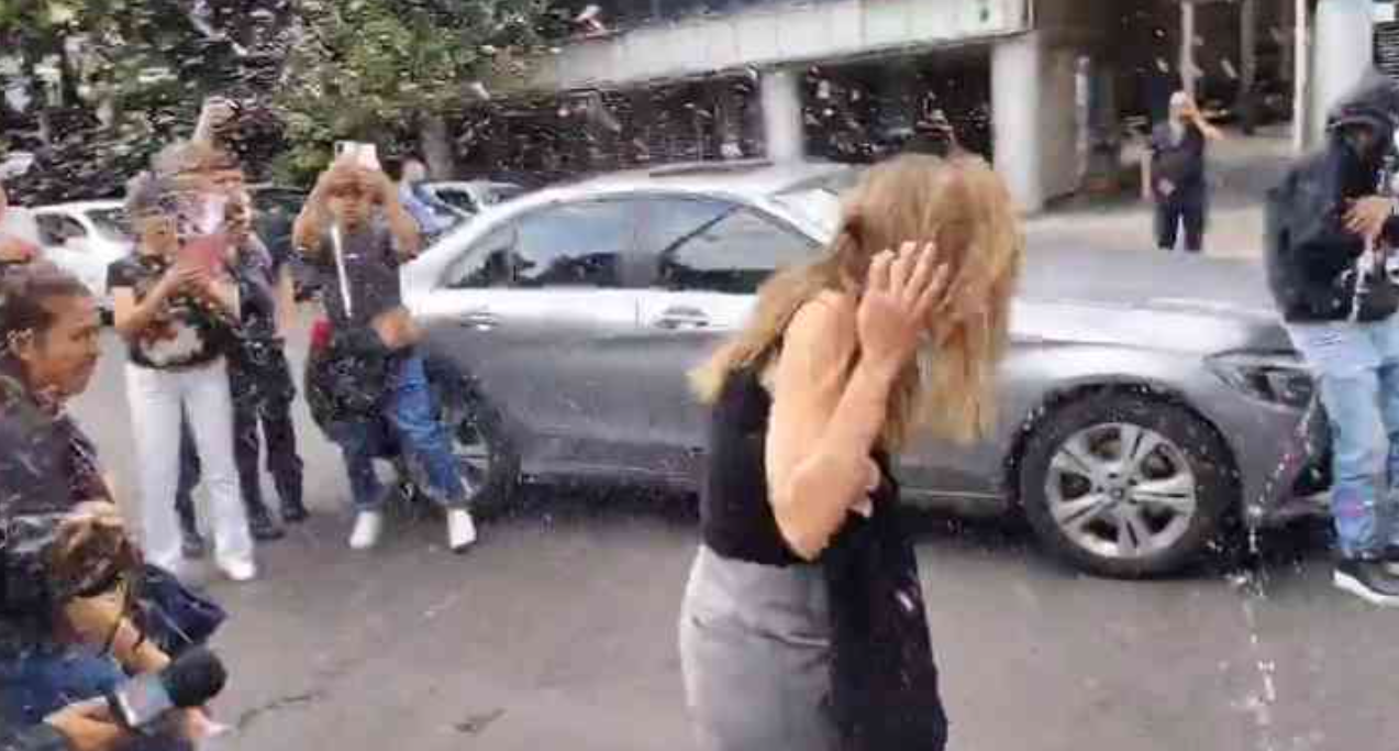 Aunque su vehículo la estaba esperando afuera del juzgado, bastó de “Lady Racista” resultara mojada a pesar que apresuro el paso para evitar mayores incidentes.
