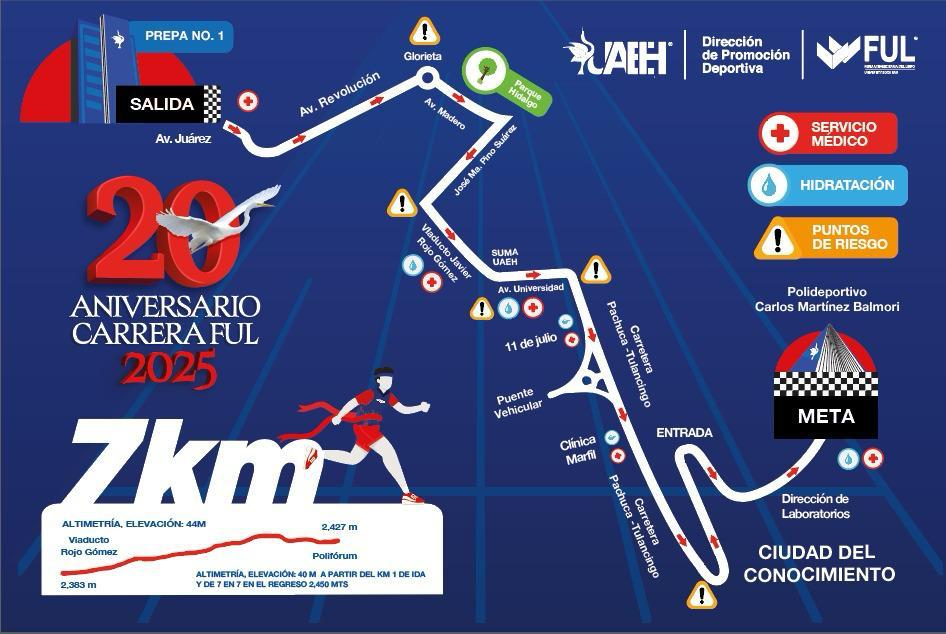Pachuca de Soto, Hidalgo. – El próximo domingo 31 de agosto, la Carrera Atlética Internacional de la Feria Universitaria el Libro (FUL) 2025, organizada por la Universidad Autónoma del Estado de Hidalgo (UAEH), celebrará su 20 aniversario con un recorrido de siete kilómetros que abarcará diversas calles y contará con estaciones de hidratación y servicio médico, para garantizar la seguridad de quienes participan.
