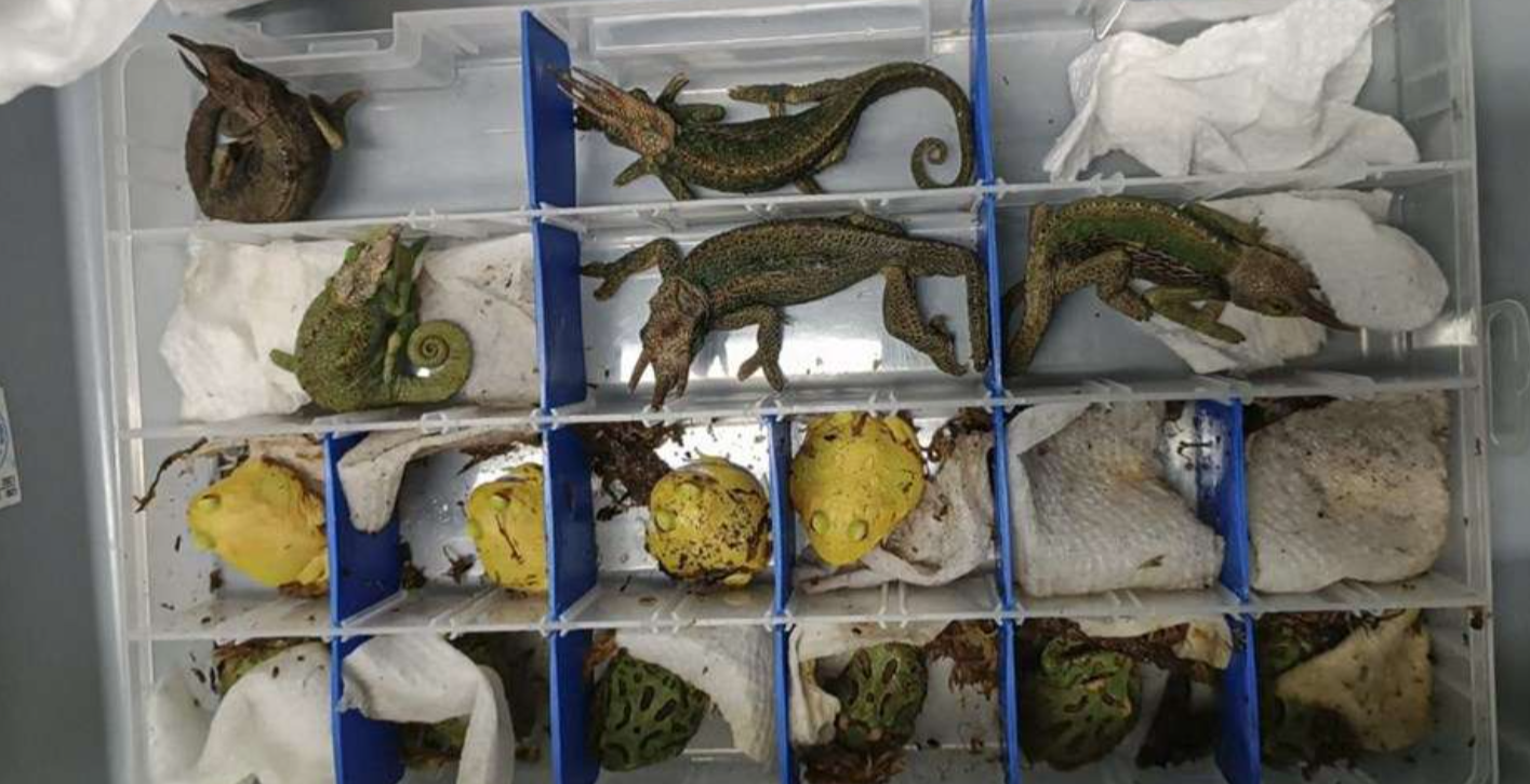 que transportaba 163 animales exóticos, entre pitones, tarántulas, ranas,